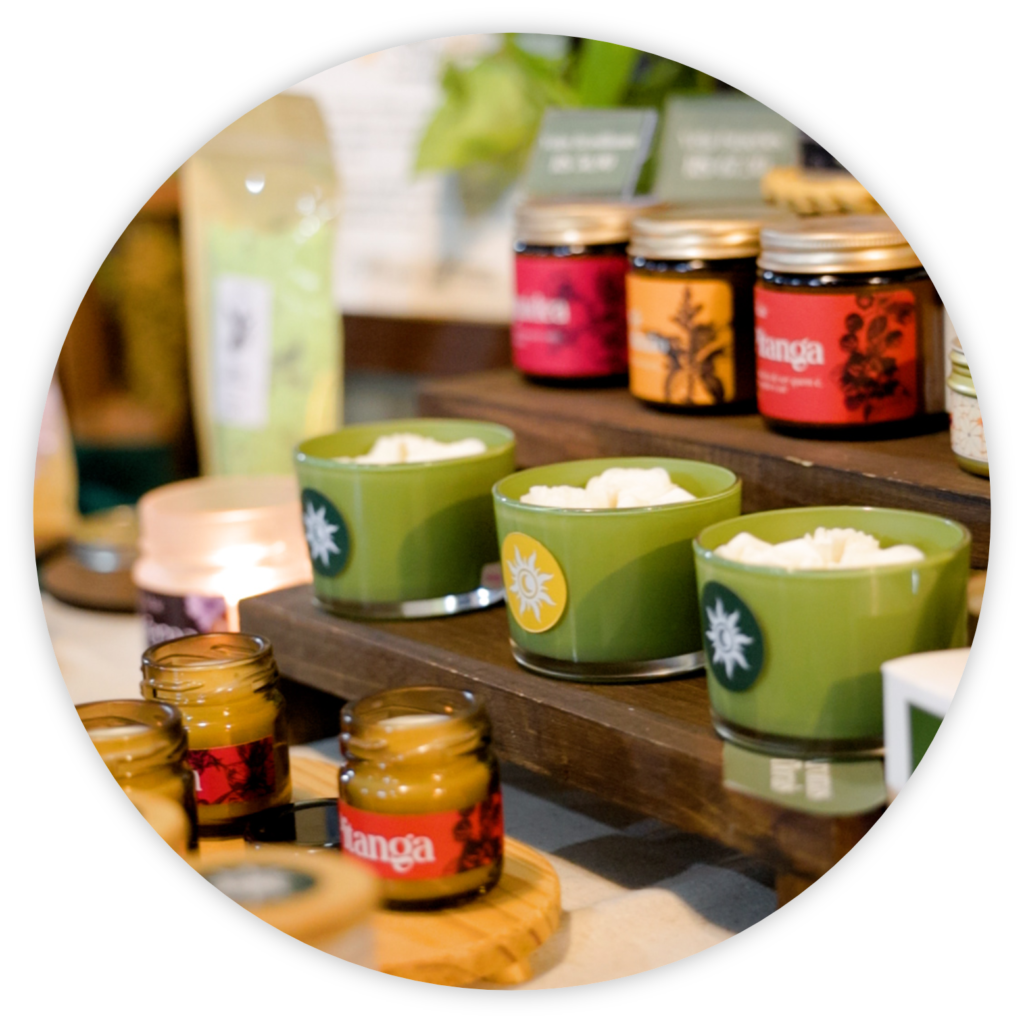 Artesanato, produtos típicos e variedades de expositores e bazaristas.